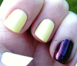 Final mani- not happy with the pics, in the sun it was sparkly yellow on the white and the models own yellow. On top of the black it became a totally different sparkle.